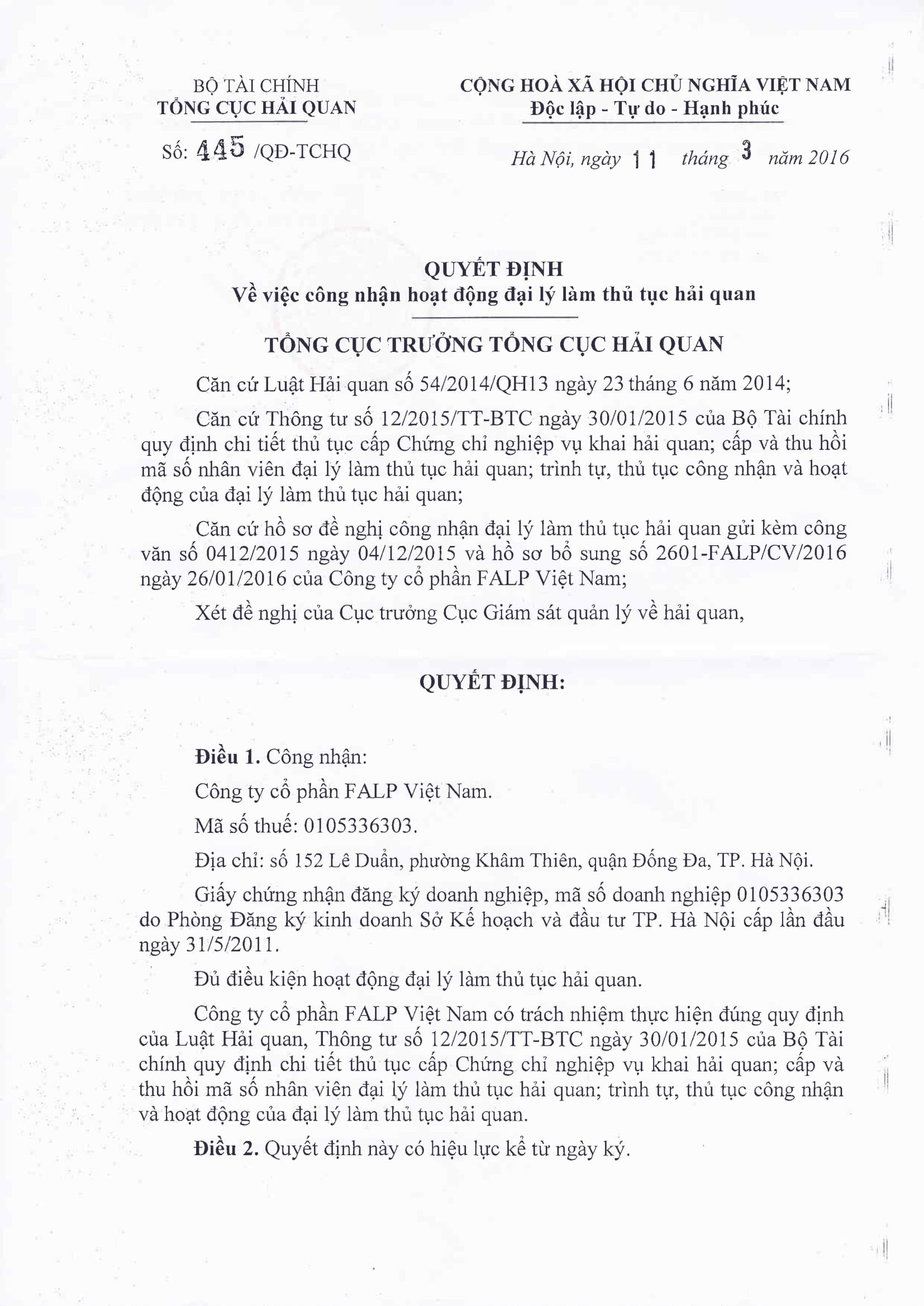 ALP Logistics Vietnam has been certified eligible to participate e-customs procedures in 2012 and become a Customs Broker in 2015.